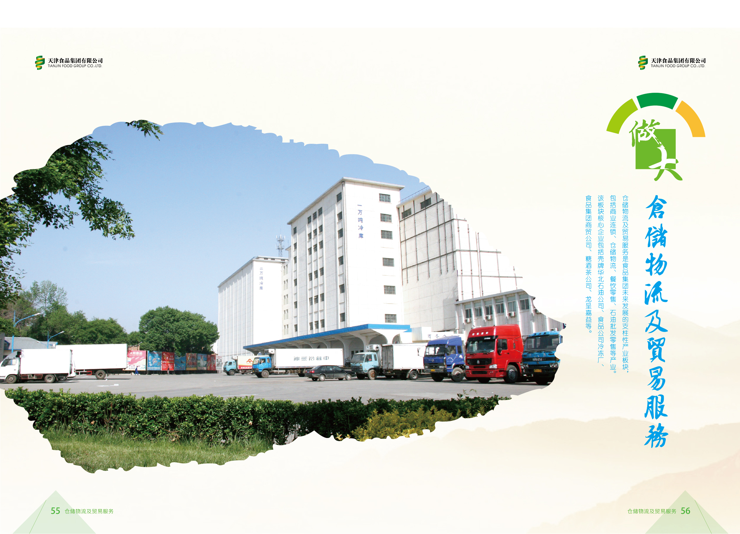 Warehousi ng, logistics and trade services are the pillar industries for the future development of Tianjin Food Group, including commercial chains, warehousing and logistics, catering retail, and refined oil wholesale and retail industries. The core companies in this sector include commerce companies, China No.2 Commercial Sugar, Tobacco & Wine Group, frozen food factories, cold chain companies, Kiessling Restaurants, and Shell North China Petroleum Company.