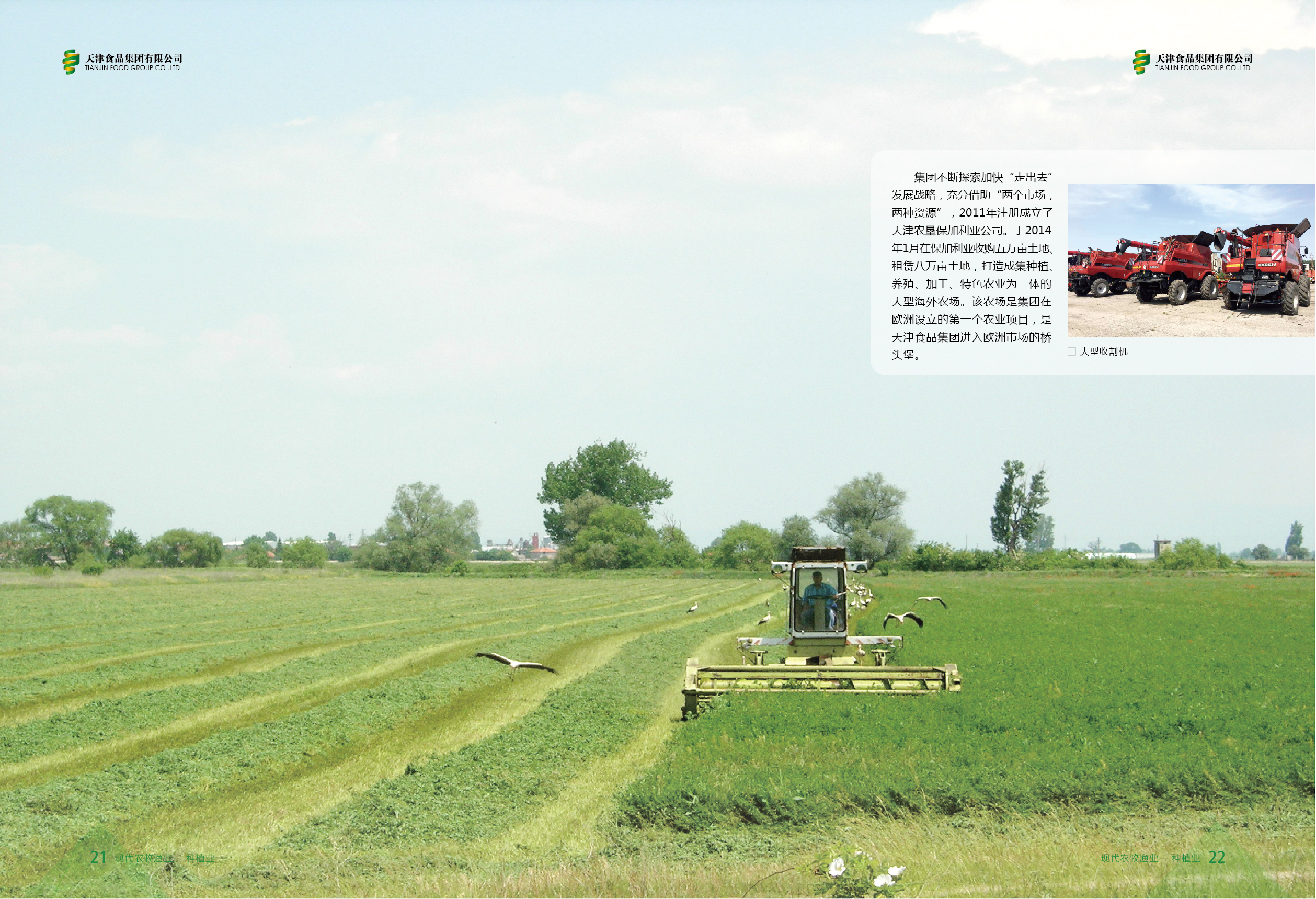 集團(tuán)不斷探索加快“走出去”發(fā)展戰(zhàn)略,充分借助“兩個(gè)市場,兩種資源”,于2011年成立天津農(nóng)墾龍呈嘉益國際貿(mào)易有限公司,在保加利亞收購、租賃土地,打造成集種植、養(yǎng)殖、加工、特色農(nóng)業(yè)為一體的大型海外農(nóng)場。該農(nóng)場是集團(tuán)在歐洲設(shè)立的第一個(gè)農(nóng)業(yè)項(xiàng)目,是天津食品集團(tuán)進(jìn)入歐洲市場的橋頭堡。The Group quickens its pace to implement the “going global” development strategy, and fully leverages the “two markets, two resources” advantage. In 2011, Tianjin Agriculture Reclamation Longcheng Jiayi International Trade Co., Ltd. was established. The company acquires and leases land in Bulgaria, and builds a large overseas farm that combines planting, breeding, processing and characteristic agriculture. The farm is the first agricultural project the Group launched in Europe, and is also the “bridgehead” for Tianjin Food Group to enter the European market.