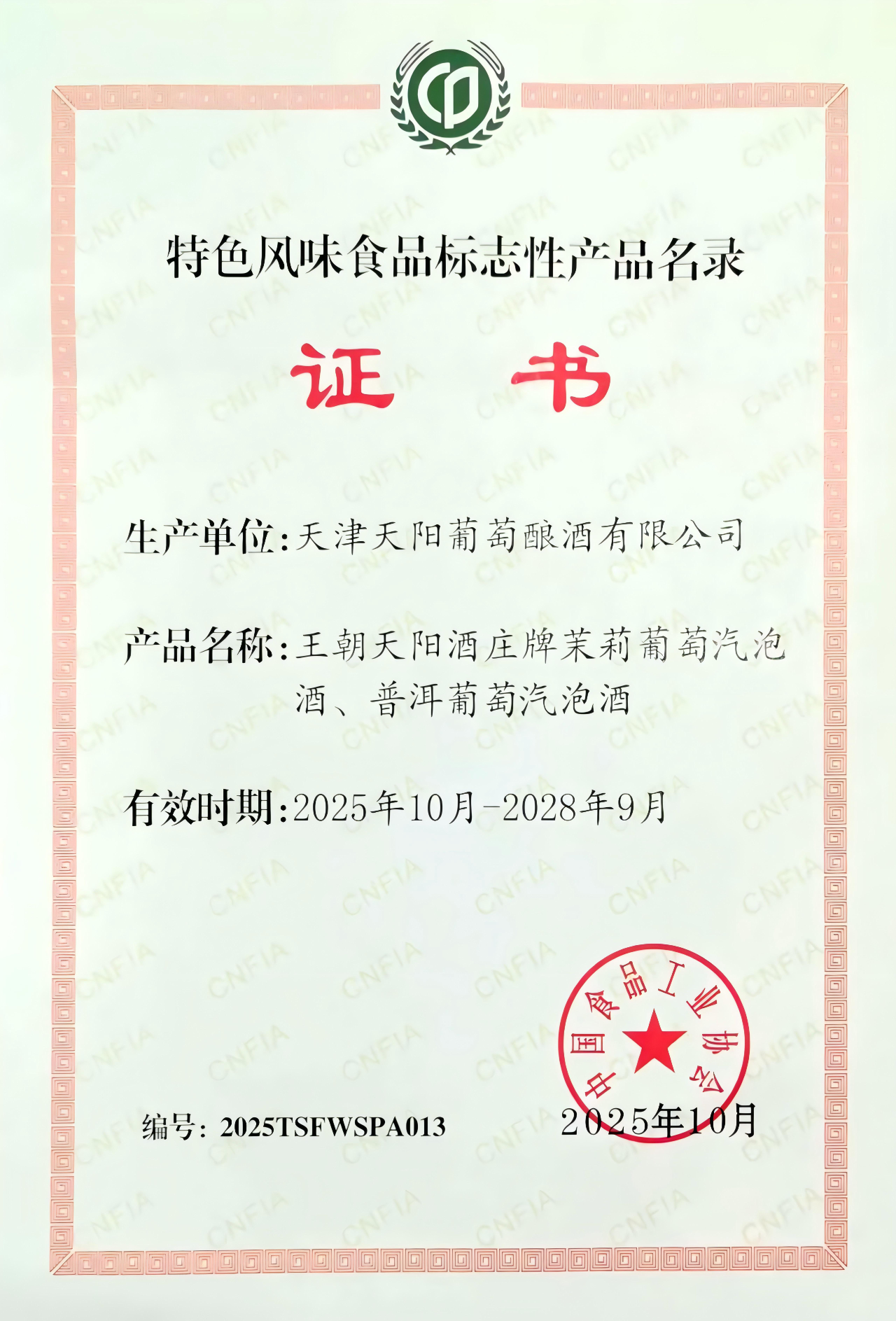 近日,王朝公司喜獲佳音——王朝天陽酒莊茉莉葡萄汽泡酒與普洱葡萄汽泡酒成功入選中國食品工業(yè)協(xié)會認(rèn)定的第二批“特色風(fēng)味食品標(biāo)志性產(chǎn)品名錄”。標(biāo)志著王朝公司的產(chǎn)品實力與品牌發(fā)展獲得了行業(yè)與市場的高度認(rèn)可。