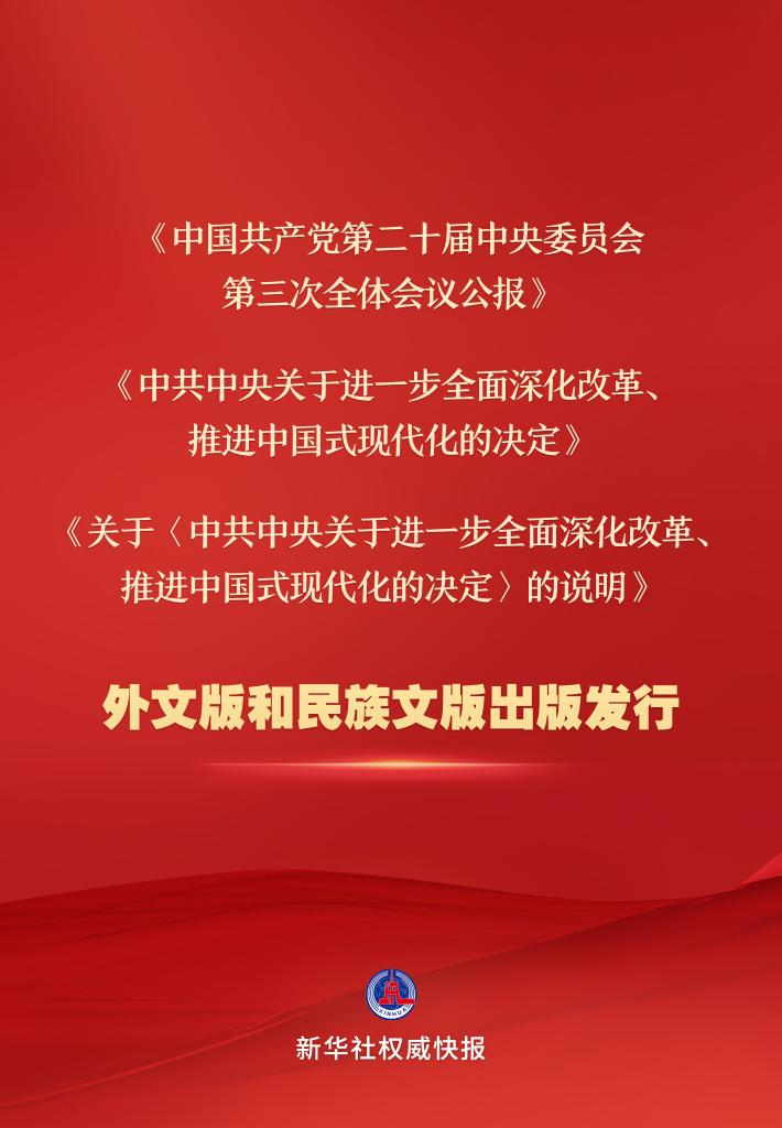 《中國(guó)共產(chǎn)黨第二十屆中央委員會(huì)第三次全體會(huì)議公報(bào)》《中共中央關(guān)于進(jìn)一步全面深化改革、推進(jìn)中國(guó)式現(xiàn)代化的決定》《關(guān)于<中共中央關(guān)于進(jìn)一步全面深化改革、推進(jìn)中國(guó)式現(xiàn)代化的決定>的說(shuō)明》的英文、法文、西班牙文、日文、俄文、德文、阿拉伯文、葡萄牙文、越南文、老撾文等10種外文版已由中央編譯出版社、外文出版社出版,面向國(guó)內(nèi)外公開(kāi)發(fā)行。