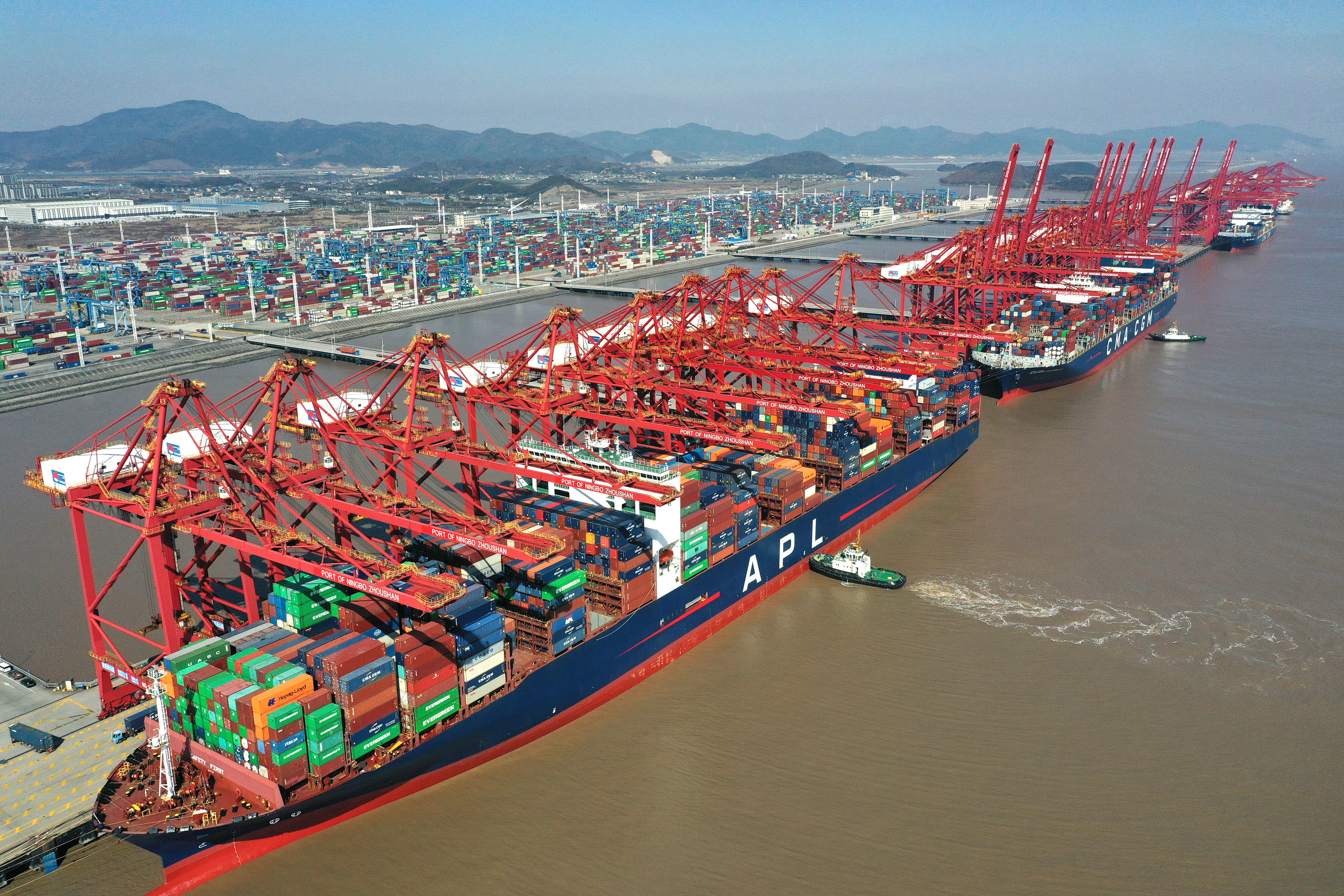 貨輪停靠在浙江寧波舟山港梅山港區(qū)碼頭(2024年1月24日攝,無(wú)人機(jī)照片)。新華社記者 黃宗治 攝