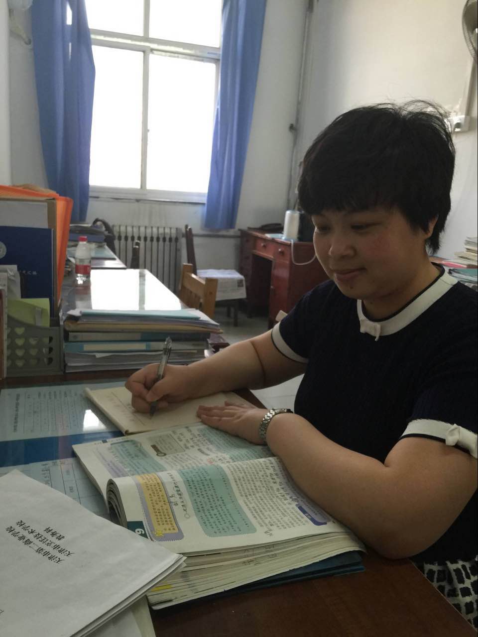 “欲影正者端其表,欲下廉者先其身”。作為一名基層黨支部書記,她深刻地體會到一名黨務工作者的一言一行在群眾眼中是何等重要;作為一名教師,她深知自己的一言一行又會對學生產(chǎn)生怎樣的影響。她曾說過:“我要對自己高標準,嚴要求,不干則已,干就干好”。支部工作中,她認真貫徹落實黨的路線方針政策和上級黨組織的決議決定,以日常教育教學工作促黨建,以提高隊伍素質(zhì)為重點,以強化管理為手段,抓好思想政治工作,加強自身的道德品質(zhì)修養(yǎng),努力發(fā)揮好共產(chǎn)黨員先鋒模范的作用。除了支部書記和教研室主任工作以外,她每周還承擔著20多節(jié)德育課的教學任務,面對如此繁重的工作,她從不抱怨,更從不耽誤,均能按時按質(zhì)完成各項工作。她家住塘沽,每天上下班路途遙遠,但她從不搞特殊,嚴格按照學校各項規(guī)章制度辦事。