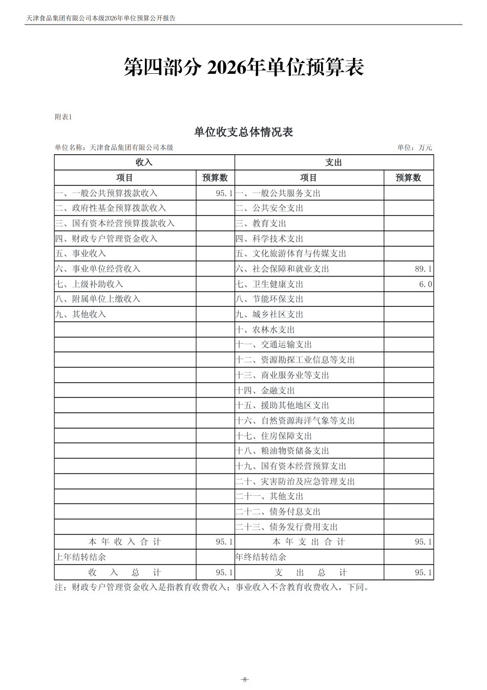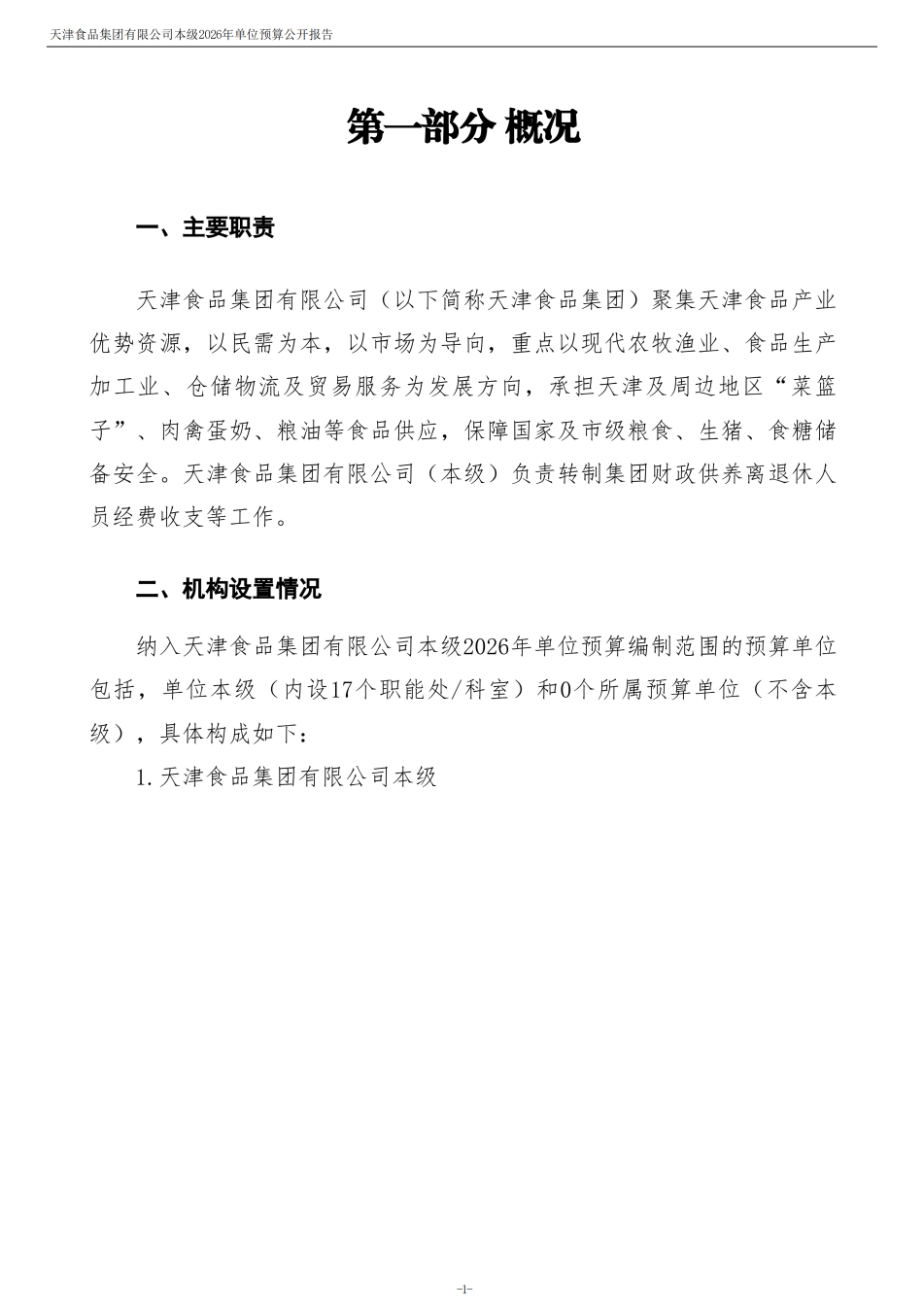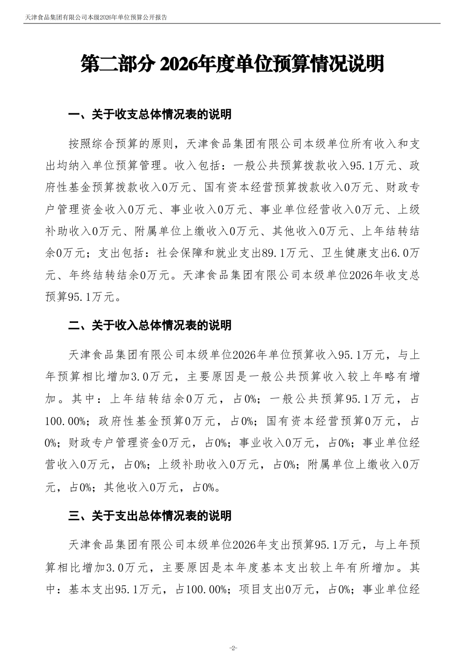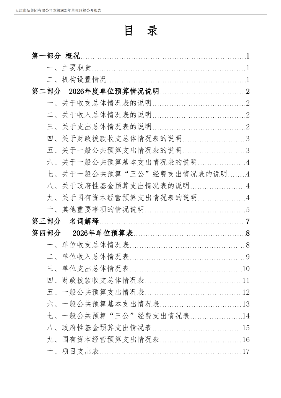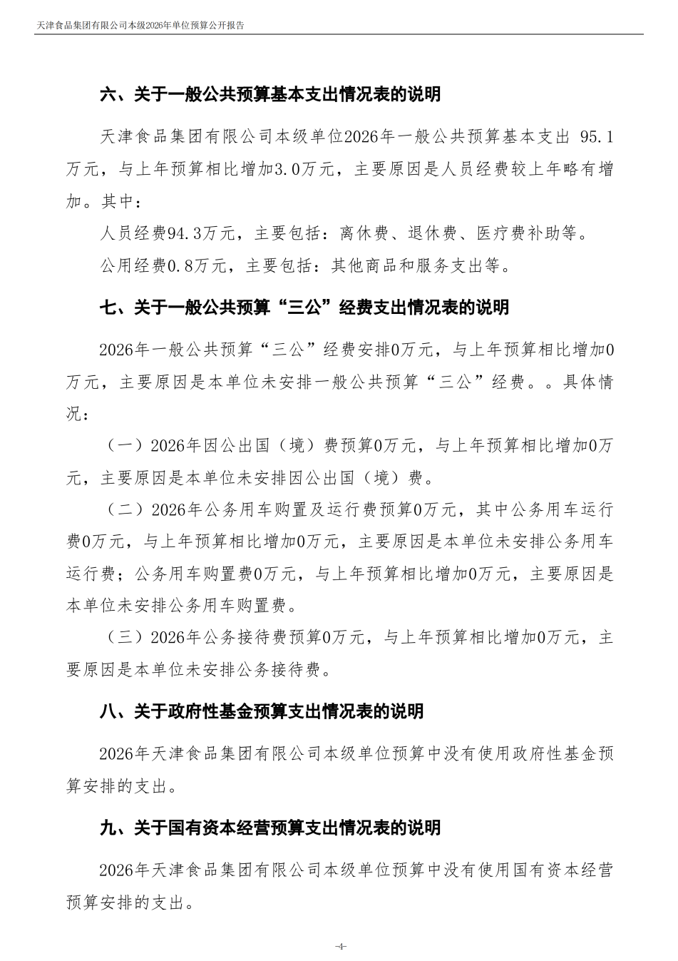 天津食品集團(tuán)有限公司本級(jí)2026年度單位預(yù)算